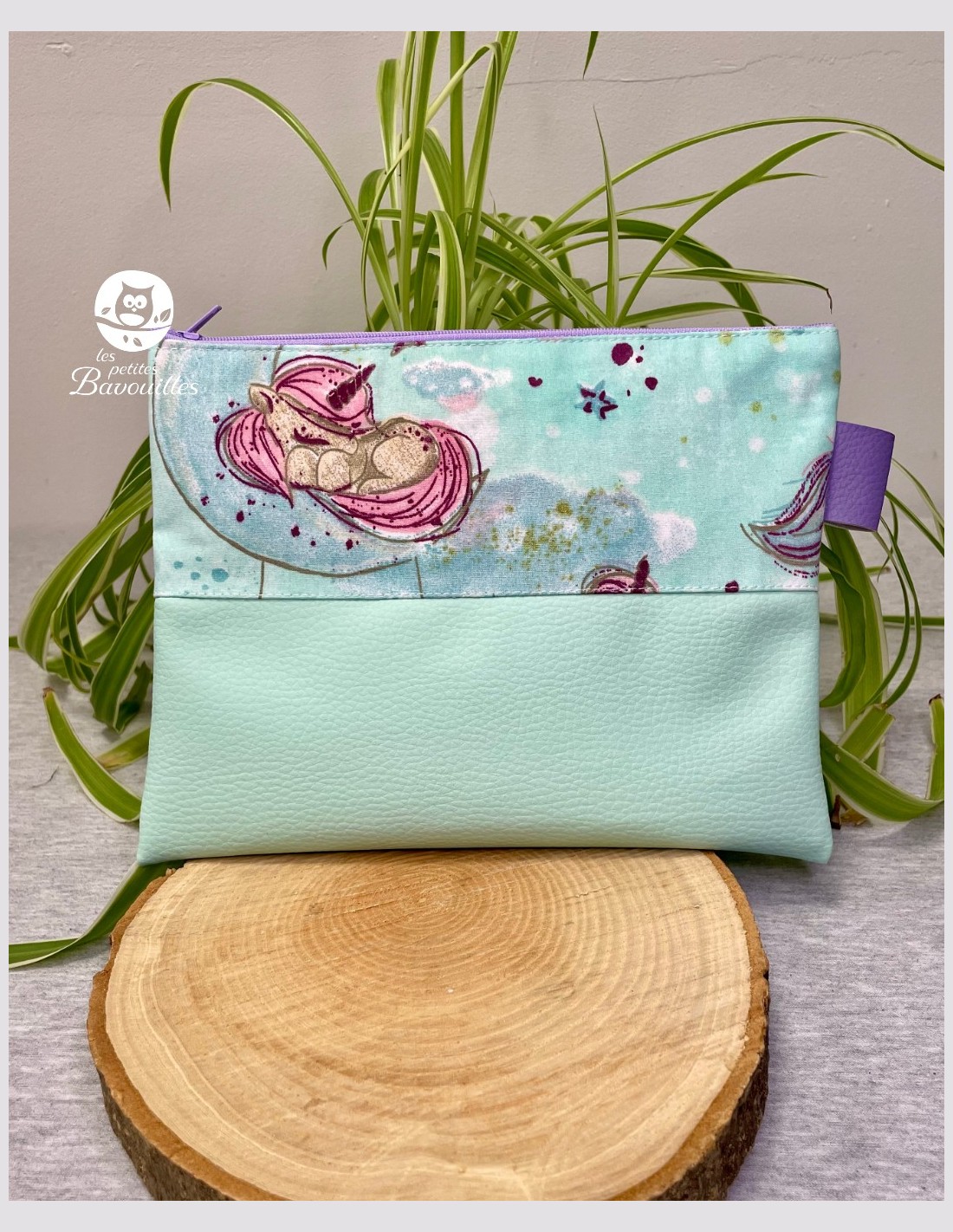 Pochette plate fait main licorne vert d'eau