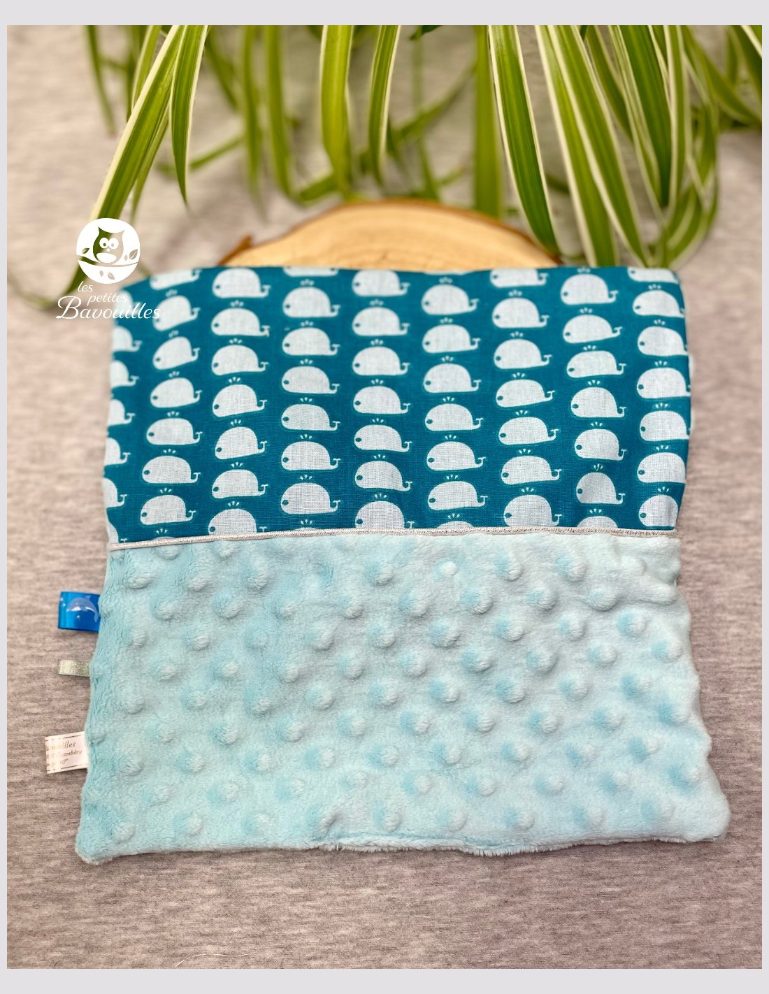 Doudou bébé carré plat tout doux fait main avec étiquette baleine